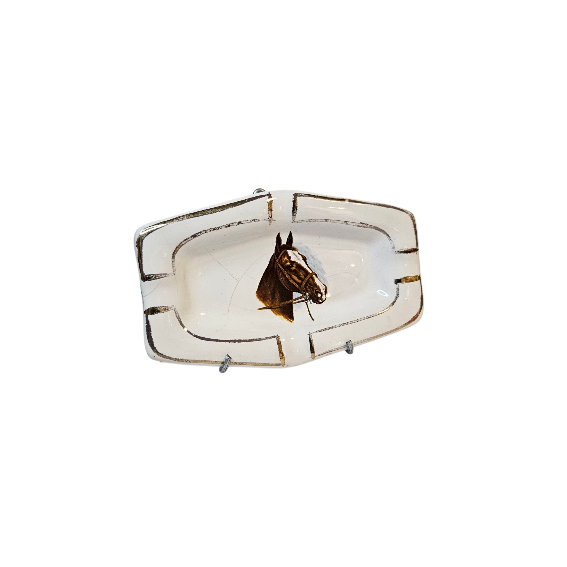 Cenicero antiguo de cerámica esmaltada con diseño ecuestre en relieve, mostrando la figura de un caballo en el centro. Este tipo de decoración, inspirada en la tradición rural y la conexión con el campo, era muy apreciada en la cerámica de mediados del siglo XX. Su forma ovalada y el brillo del esmalte le otorgan un aspecto refinado y armónico, ideal tanto como objeto decorativo como para coleccionar.