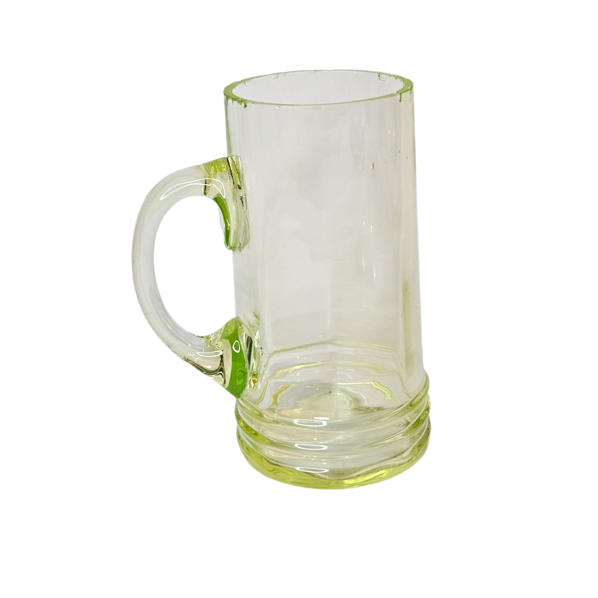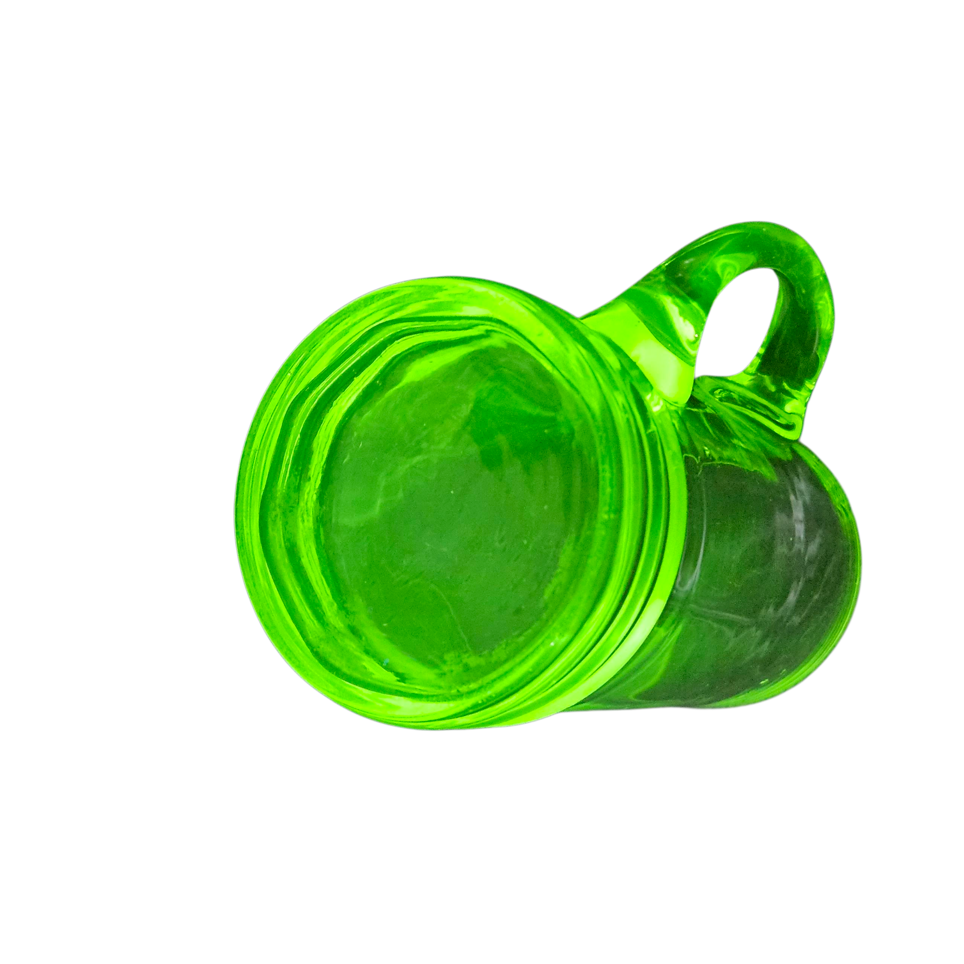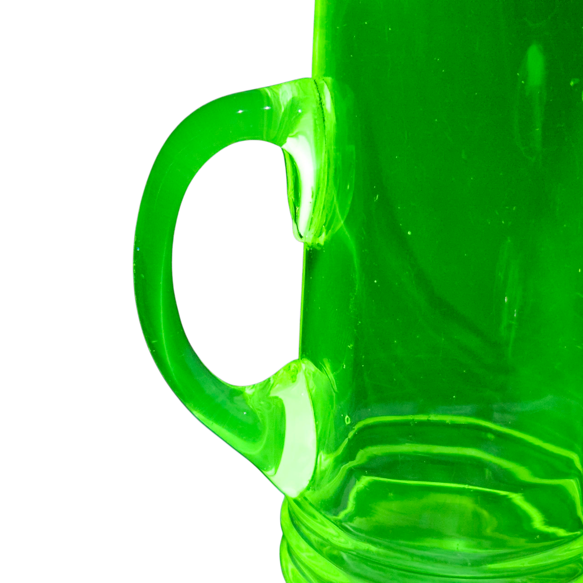 Una verdadera joyita del vidrio antiguo: jarra de vidrio uranio, reconocible por su característico tono verdoso bajo la luz natural y su intensa fluorescencia verde bajo luz ultravioleta.