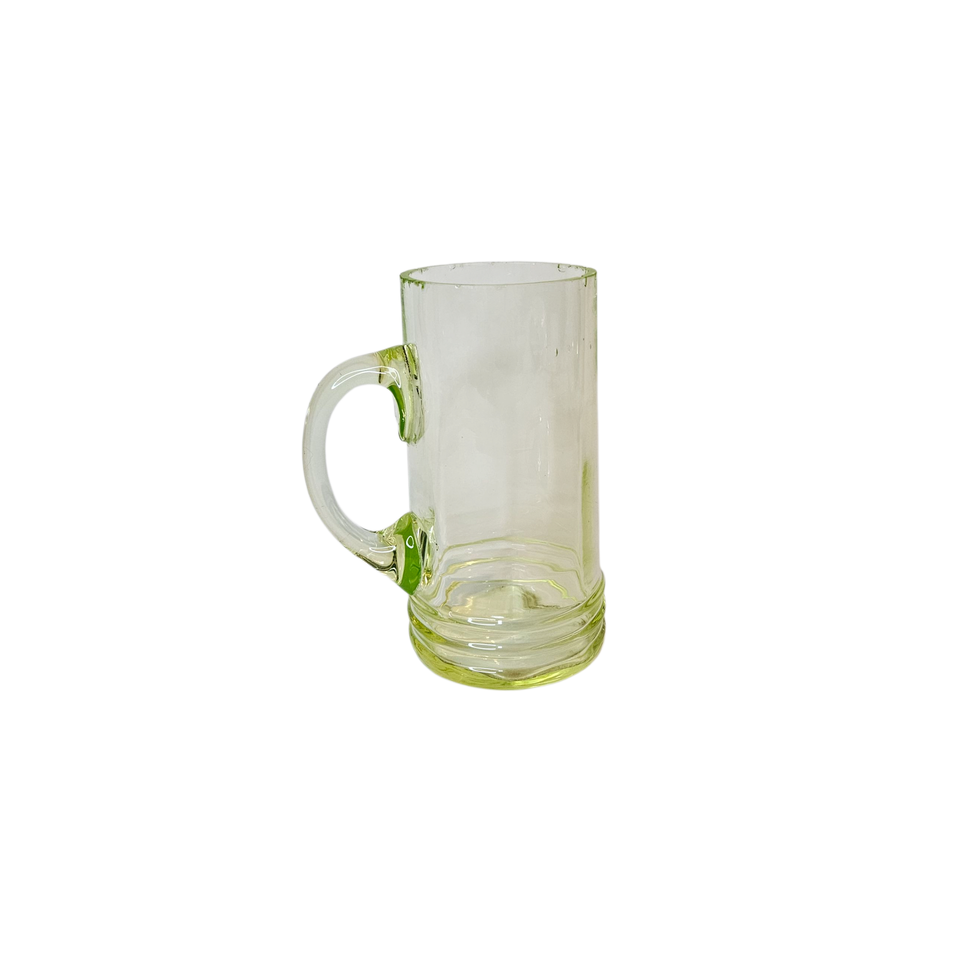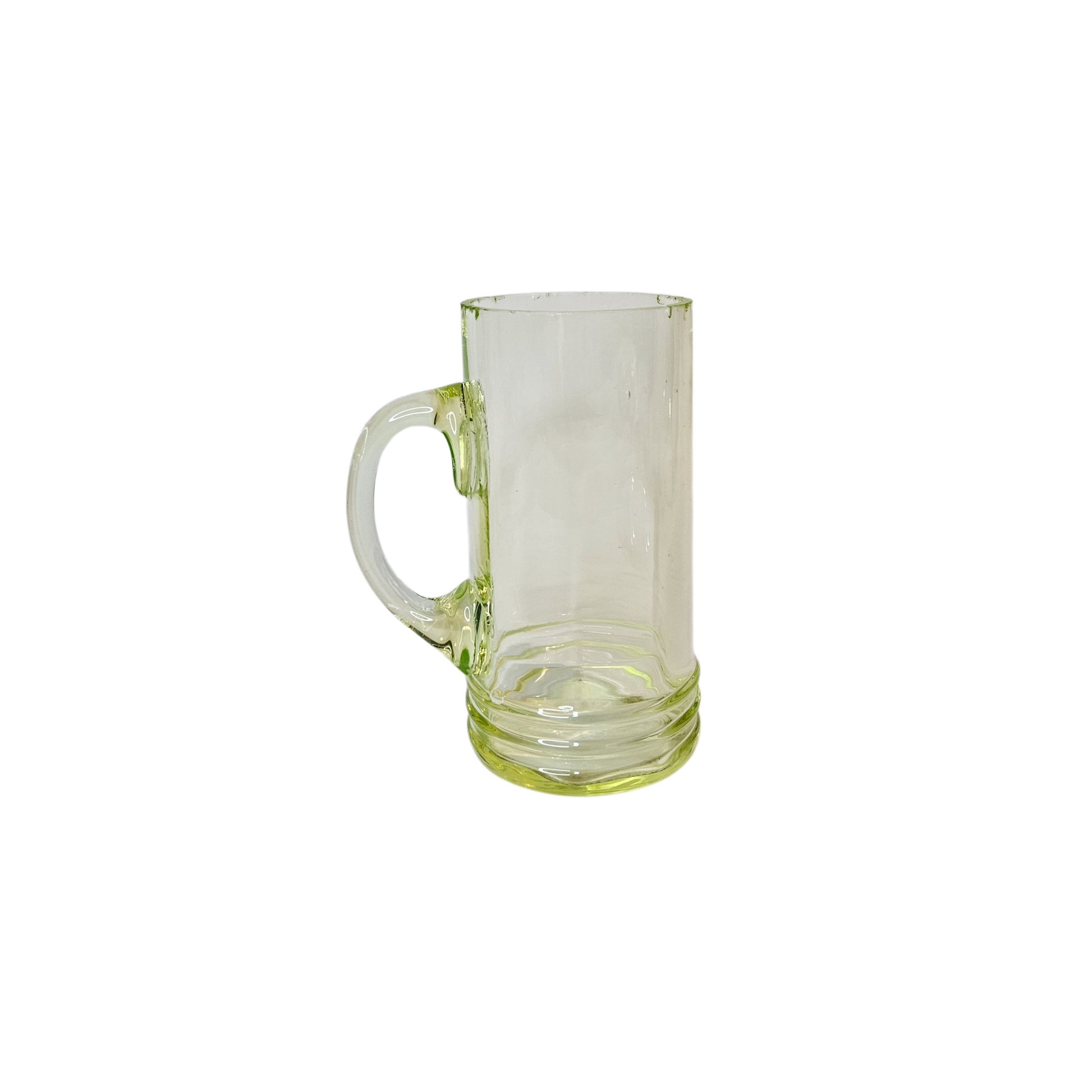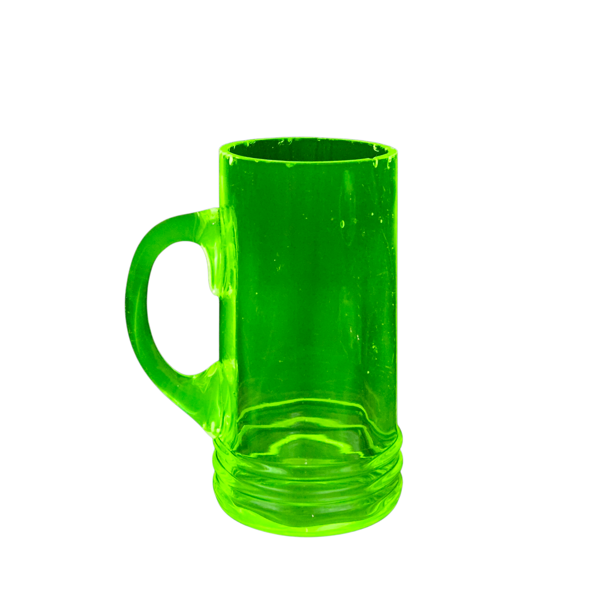 Una verdadera joyita del vidrio antiguo: jarra de vidrio uranio, reconocible por su característico tono verdoso bajo la luz natural y su intensa fluorescencia verde bajo luz ultravioleta.