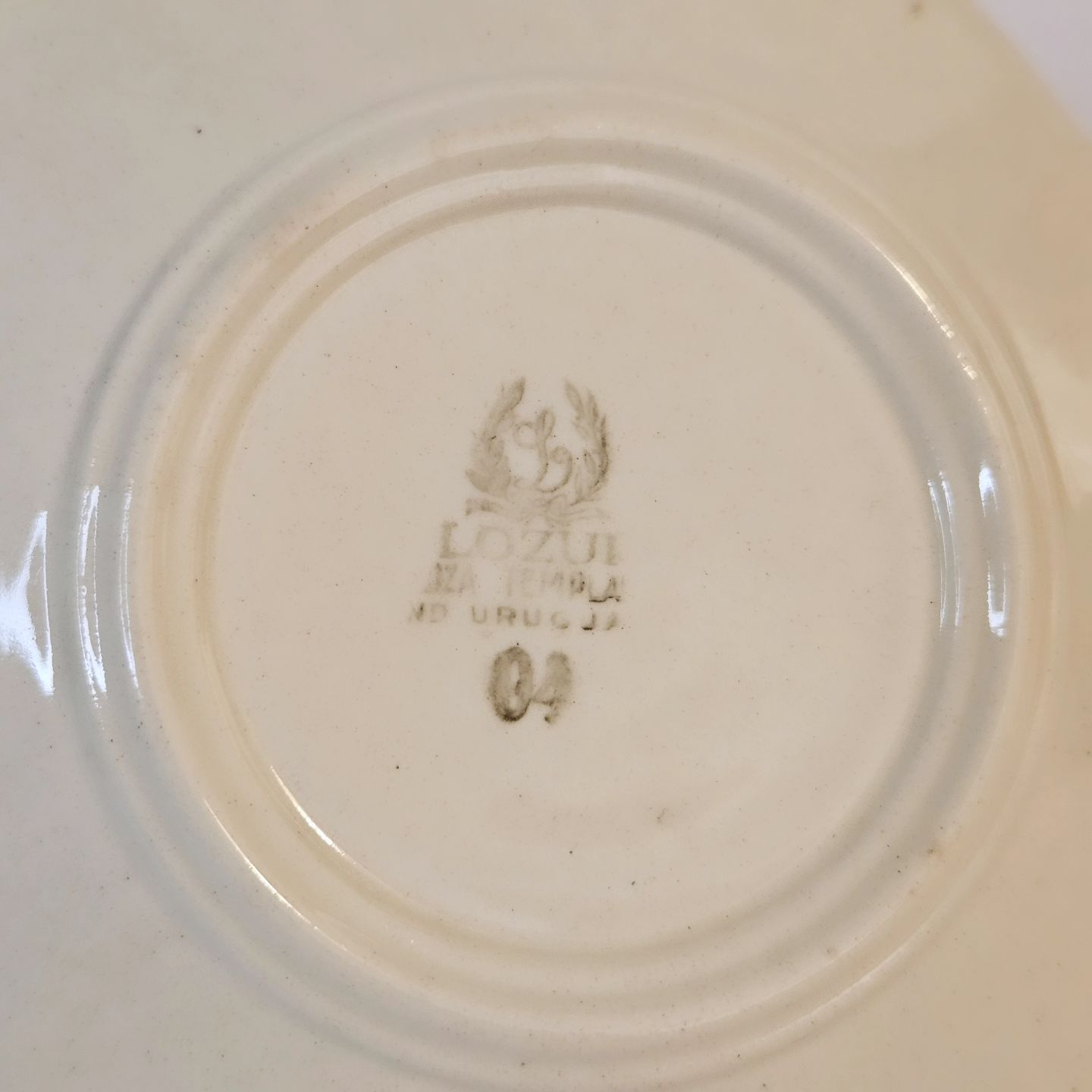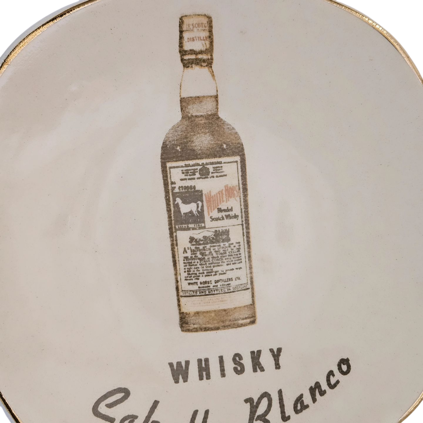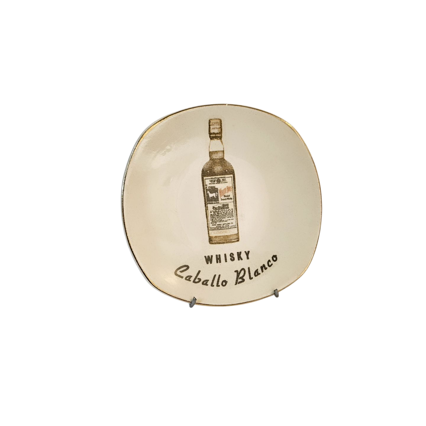 Este pequeño plato publicitario de Whisky White Horse— fue producido por Lozur, una de las fábricas cerámicas más reconocidas de Uruguay. La pieza combina la gráfica original de la etiqueta con una delicada impresión bajo esmalte y un borde dorado que resalta su elegancia.