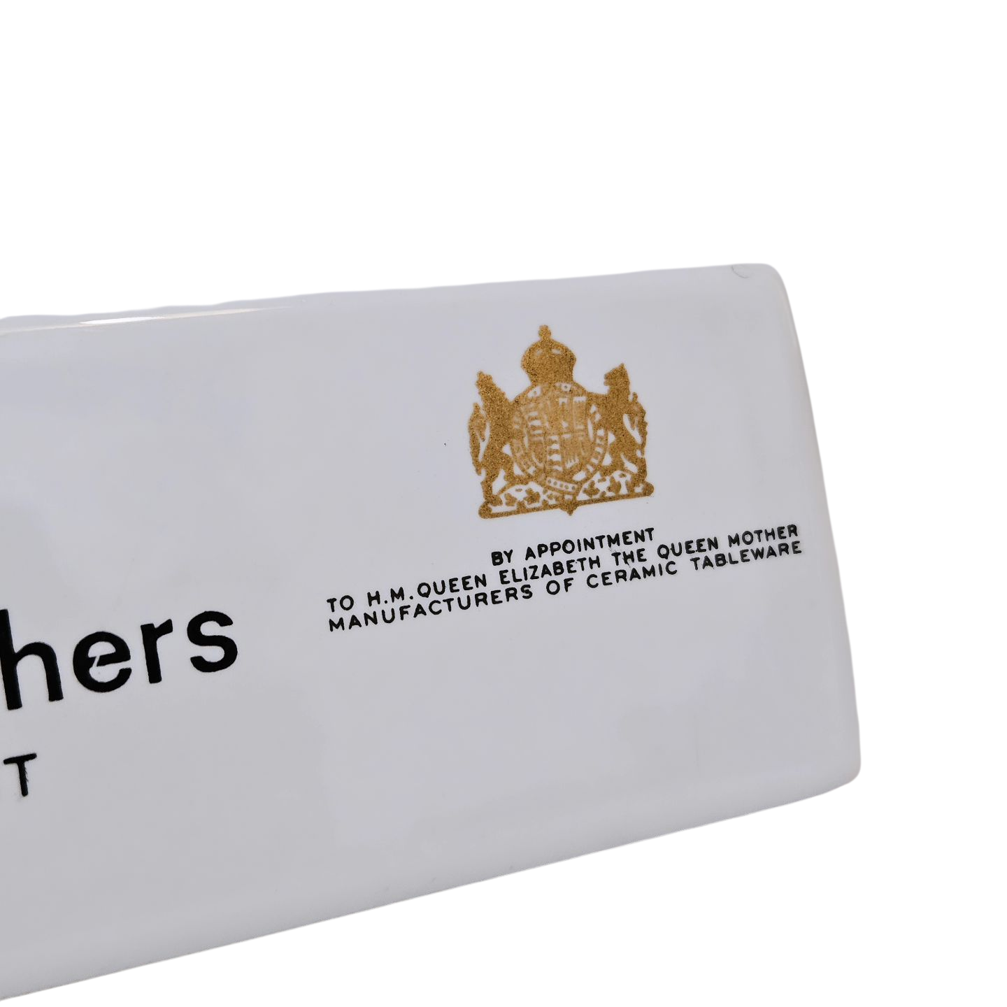 Raro cartel publicitario cerámico de mostrador Johnson Brothers, manufactura inglesa de Stoke-on-Trent, reconocida por su fina vajilla y cerámica de mesa. Esta pieza presenta el escudo real dorado y la inscripción “By appointment to Her Majesty the Queen”, distintivo honor otorgado a fabricantes que proveen a la Casa Real británica.